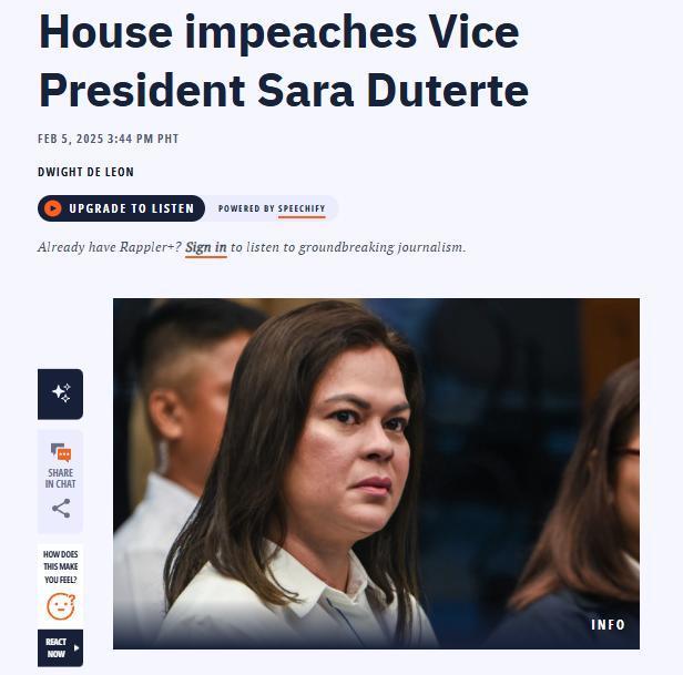 ⭐菲律宾历史上首次!副总统遭弹劾当地时间5日,针对菲律宾副总统莎拉·杜特尔特的弹劾案获得了众议院三分之二以上议员的支持。该弹劾案将提交给参议院,莎拉·杜特尔特将在参议院面临弹劾审判。这是该国第一起针对现任副总统的弹劾案。